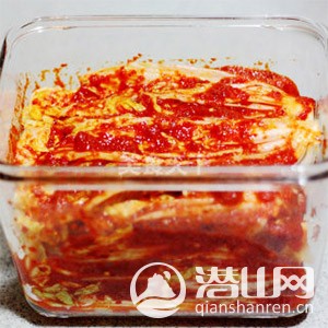 9从大白菜根部开始,一层层抹上做好的辣椒酱,放入密封保鲜盒中,入冰箱冷藏腌制,24小时后就可以吃了。