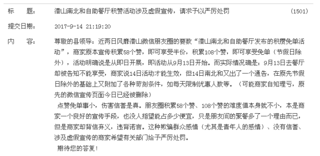 潜山南北和餐厅点赞免单涉嫌虚假宣传被投诉,县食监局有说法了! |