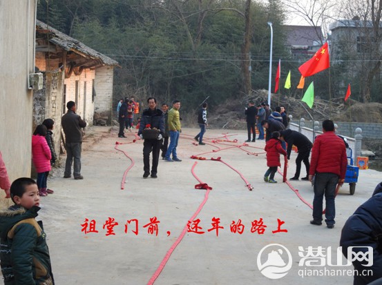 大年三十的傍晚,大家来祖堂还年的路上。先到的小伙子们在摆弄鞭炮、烟花,等大家全部到齐时,就开始燃放,过年也就开始了!
